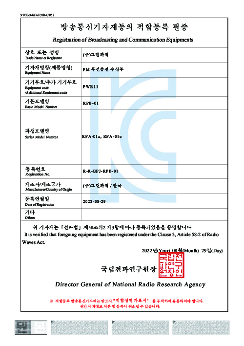 | 수신 모듈 | 출력 전압/전류 | Max. 54.6V/1.54A | CC : 1.54A, CV : 54.6V |